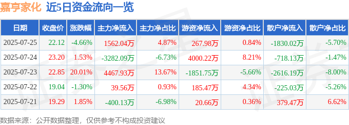 证券之星消息,截至2025年7月25日收盘,嘉亨家化(300955)报收于22.12元,下跌4.66%,换手率23.93%,成交量14.08万手,成交额3.21亿元。 7月...